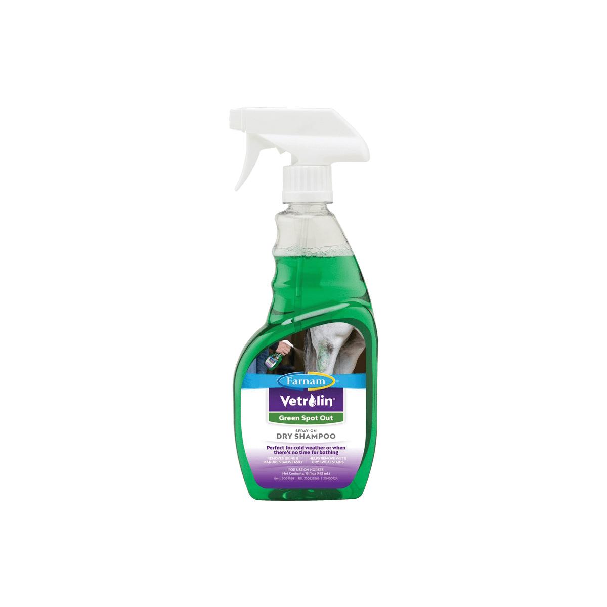 Banish manure and urine stains without bathing your horse using Vetrolin green spot out. This spray on, dry clean shampoo is perfect for cold weather or when there's no time for bathing.