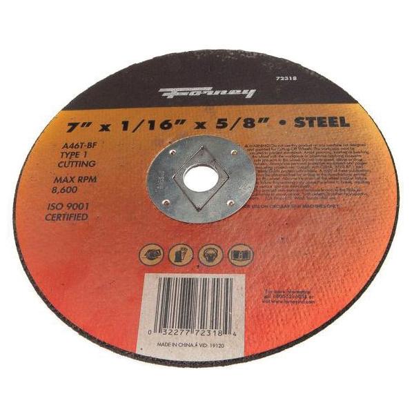 Forney® Cutting Wheel, Type 1 Wheel, 7 in Diameter, 1/16 in Thickness, 5/8 in Arbor, 46 Grit, Medium Grit Grade, Aluminum Oxide Abrasive, 8600 rpm, Resinoid Bond, Fiberglass Bond, Applicable Materials: Ferrous Metal