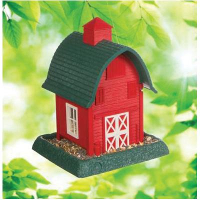 The red barn birdfeeder is part of an extensive Village collection of feeders. This feeder is reminiscent of a country red barn with white accents and a green roof. Measuring 10-1/4 x 9-1/2 x 13 in, this feeder has the capacity to hold 5 lb of seed. For monitoring seed levels, its windows are framed with clear plastic panes. The roof contains a lift-off cupola to make filling this feeder a breeze. The large tray/perch is removable for easy clean out. This versatile feeder can either be used as a hanging birdfeeder or pole mounted and offers a three year warranty. made from durable molded plastic, this feeder will last for years to come. Proudly made in the USA.