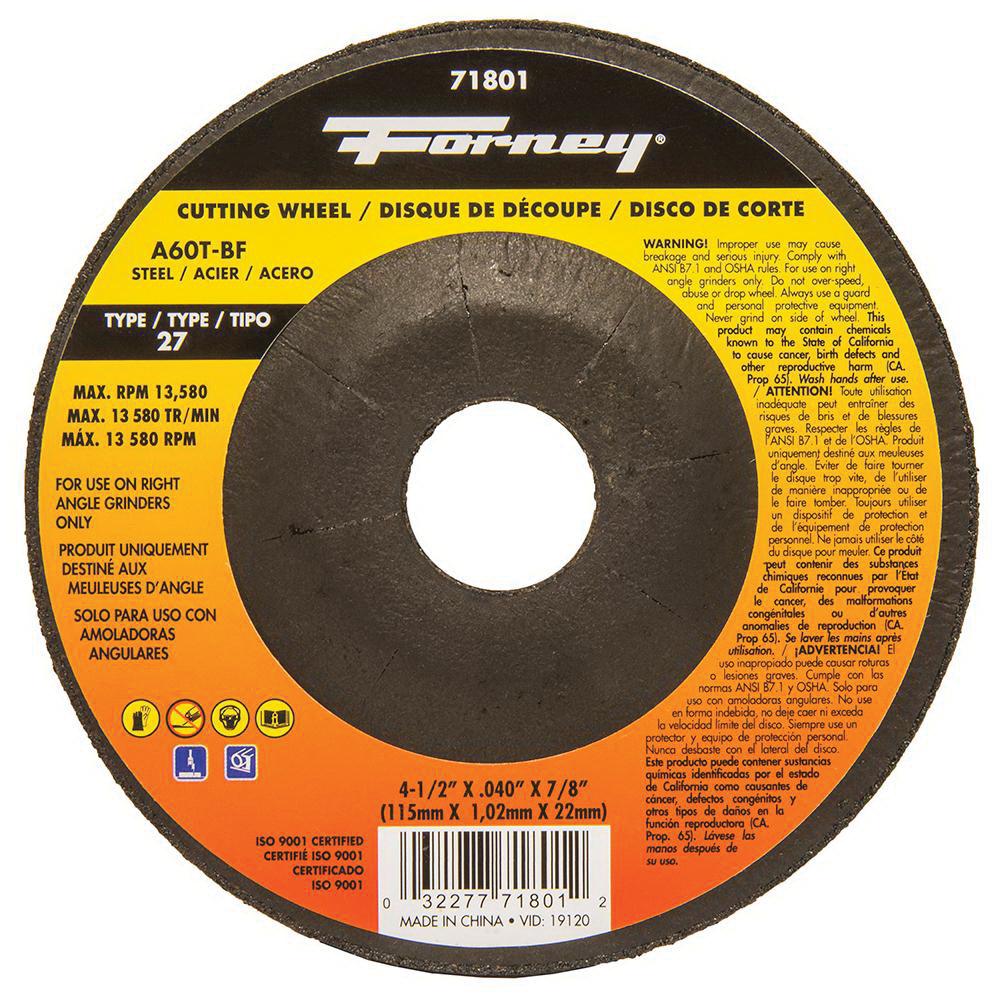 Forney® Cut-Off Wheel, Type 27 Wheel, 4-1/2 in Diameter, 0.04 in Thickness, 7/8 in Arbor, 60 Grit, Medium Grit Grade, Aluminum Oxide Abrasive, 13580 rpm, Resinoid Bond, T Hardness, Applicable Materials: Ferrous Materials
