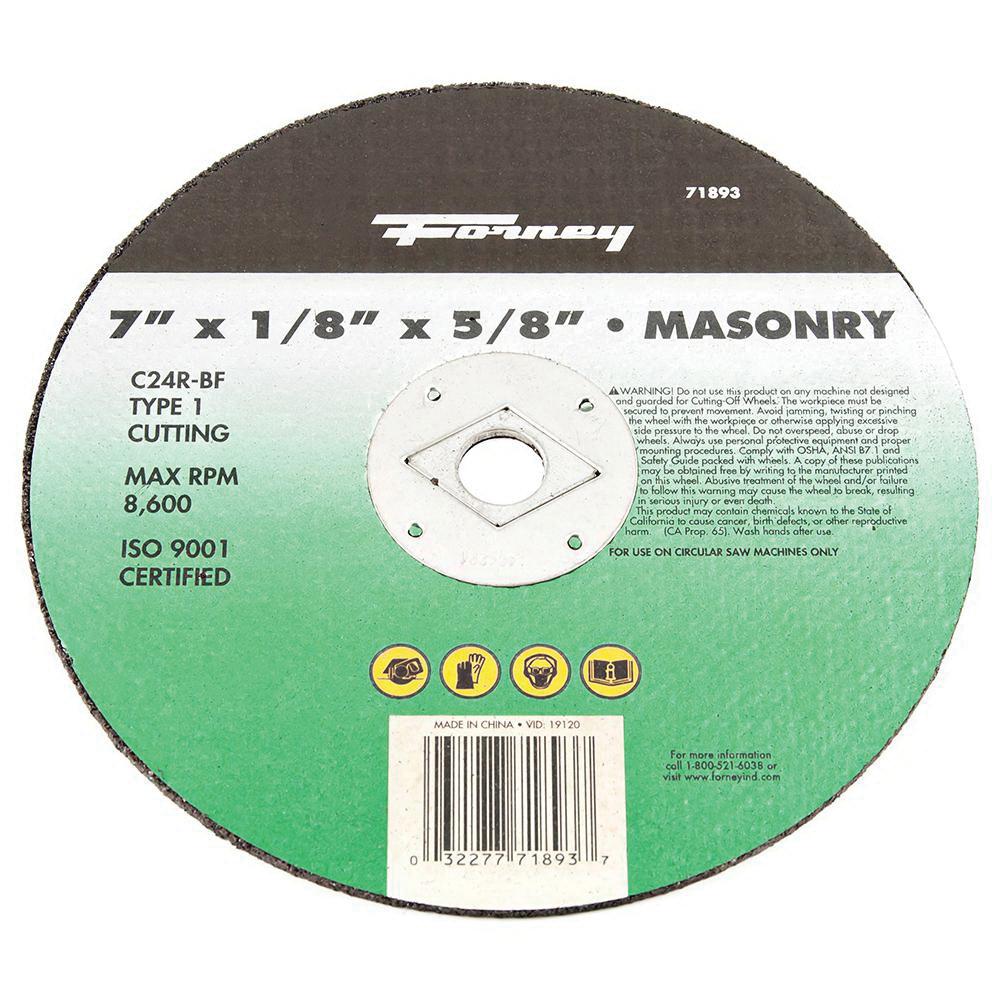 Forney® Cutting Wheel, Type 1 Wheel, 7 in Diameter, 1/8 in Thickness, 5/8 in Arbor, 24 Grit, Coarse Grit Grade, Silicon Carbide Abrasive, 8600 rpm, Resinoid Bond, R Hardness, Applicable Materials: Ceramic, Masonry, Non-Ferrous Materials, Plastic
