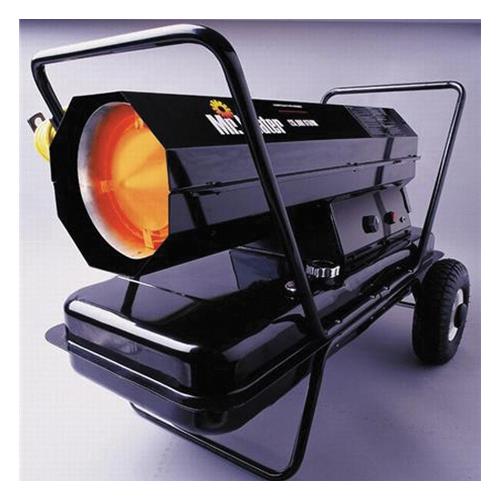 Mr. Heater® Forced Air Diesel and Kerosene Heater, 8.5 gal, 115 V, 5.5 A, 60 Hz, 140000 Btu/hr, Diesel, Jet Fuel, Kerosene, 3500 sq-ft Heating Area, Steel, Additional Information: 8.5 gal Tank, 10 in Flat-Free Tires, 8 hr Run Time