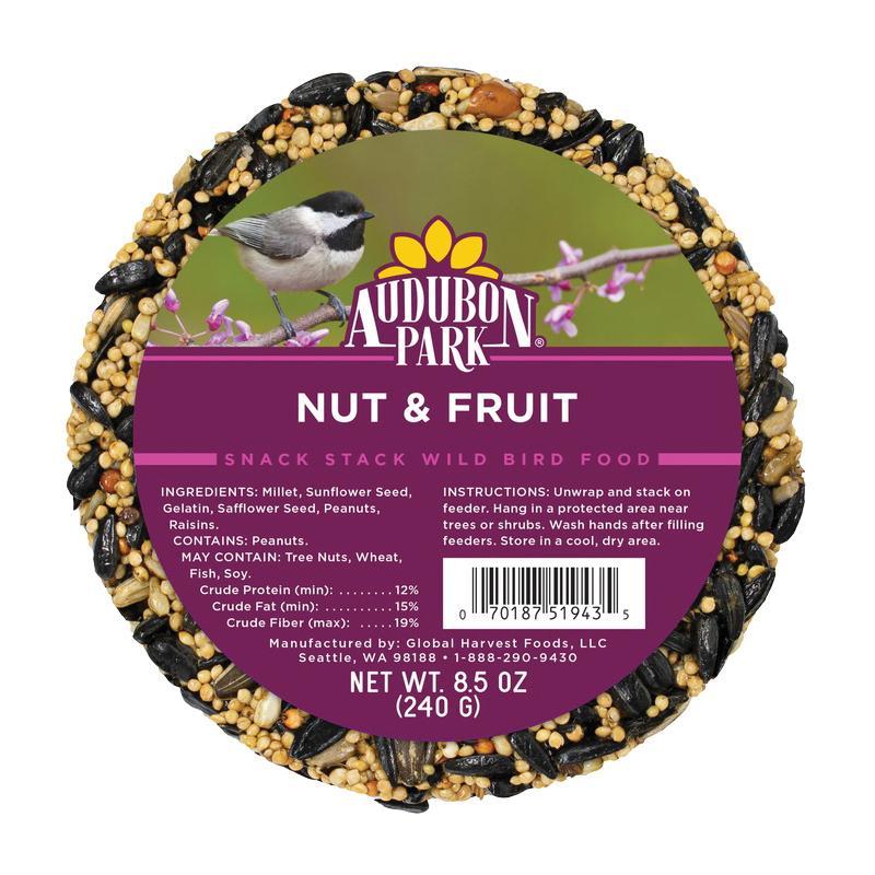 Part of our pressed bird seed collection, Audubon Park Nut & Fruit Snack Stacks are a fun and easy way to invite a variety of fruit and nut-loving birds to your yard.